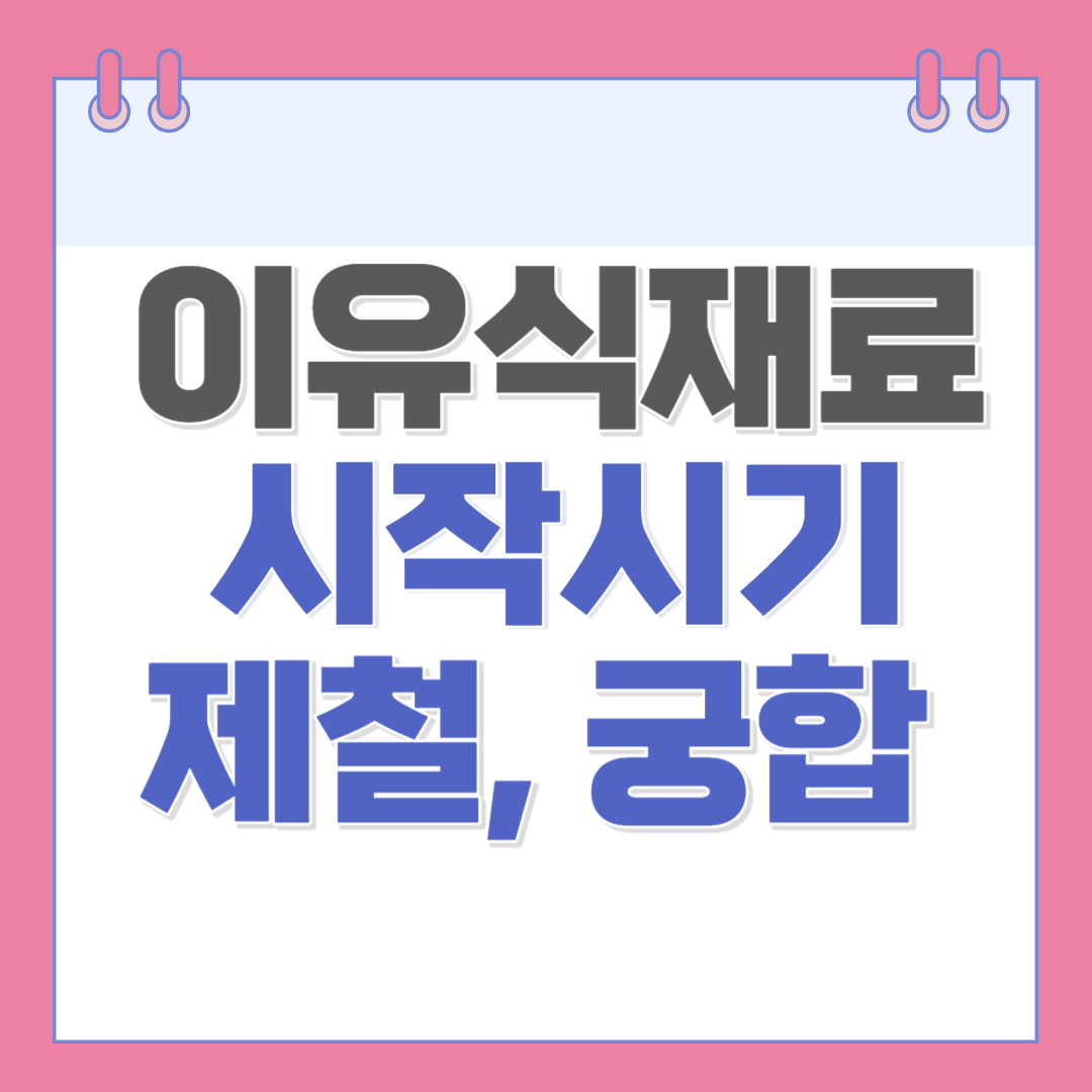 이유식 재료 시작시기, 제철재료, 재료별 궁합 이유식 재료 시작시기 슈슈 초기 중기 후기 완료기 5개월 6개월 7개월 8개월 9개월 12개월 곡류 쌀 밀가루 옥수수 설기떡 식빵 과일 사과, 배 바나나 멜론 포도 오렌지, 귤, 키위, 레몬, 복숭아 콩 완두콩, 강낭콩 두부 팥, 두유 국수 소면,우동면,칼국수,메밀국수,스파게티 육류 소고기 닭고기 (기름없는부위) 돼지고기 (요즘엔 빨리 먹여도 된다고 함) 유제품 달걀노른자 플레인 요구르트 아기치즈 메추리알, 요구르트, 생우유, 생크림, 버터 조개류 모시조개, 홍합, 대합, 맛조개, 소라 어류 조기, 대구, 갈치 (흰살생선) 잔멸치, 연어 고등어, 뱅어포, 새우, 게, 오징어 견과 해조류 참깨, 김, 다시마 미역 한천 주스 통조림 포도주스, 사과주스, 오렌지주..